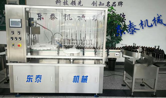 對于注重快速精準的小瓶灌裝,迅捷機械拿出了自己的方案,那就是新一代的小瓶灌裝機。該小瓶灌裝機屬于全自動旋轉式,適用于小劑量液體灌裝,如精油、眼藥水、口服液、糖漿、電子煙油、藥液等。集灌裝旋蓋為一體,灌裝穩定精準,旋蓋不傷瓶,是小瓶液體灌裝的理想機器。